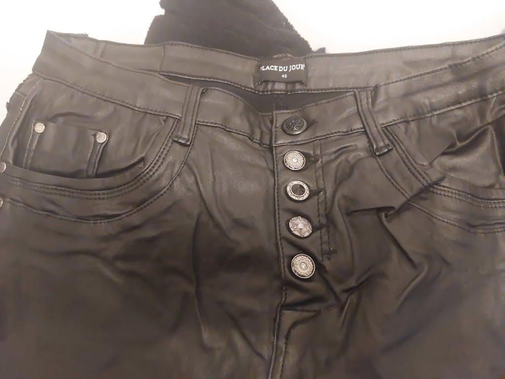 Pantalon boyfriend en simili cuir, agrémenté de boutons fantaisie pour un look moderne et audacieux. Parfait pour un style casual chic.