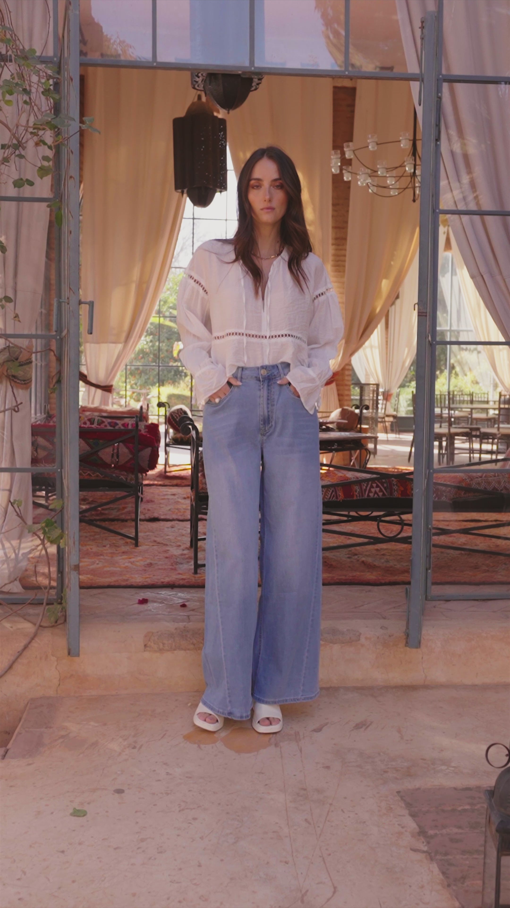 Ce jean bleu, à la taille haute flatteuse, offre une coupe évasée pour un look tendance et confortable. Polyvalent et facile à assortir, il est idéal pour toutes les occasions.